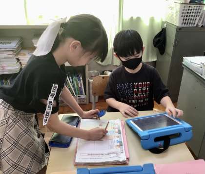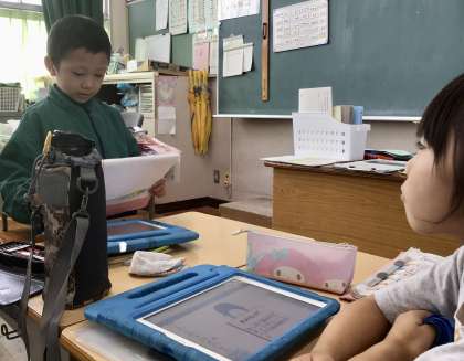 子どもたちは、自分の話し方を発表動画としてタブレットで撮影。
