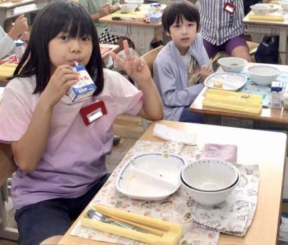 10月7日(月)の梅坪小(10)3年生の給食風景