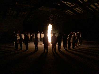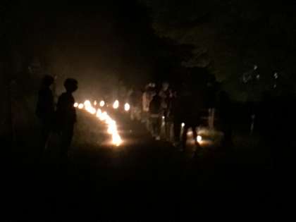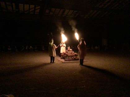 1日目、最後の活動はキャンプファイヤーです。火の神様からいただいた火を囲んで、各クラスの出し物を楽しみました。最後は幻想的なファイヤーロードを通って、自然の家に戻りました。