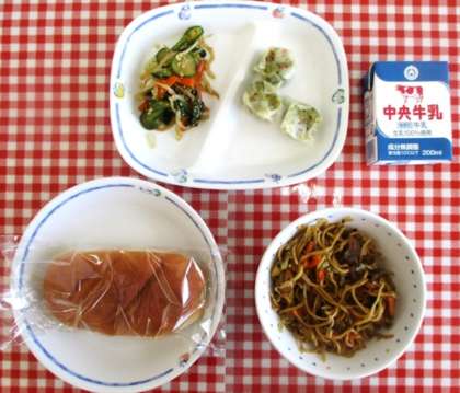 今日は、ひさしぶりの、米粉パンに焼きそばの鉄板メューです。