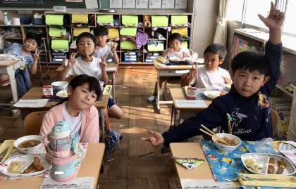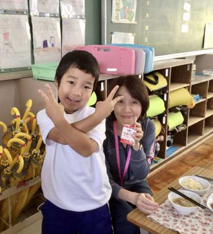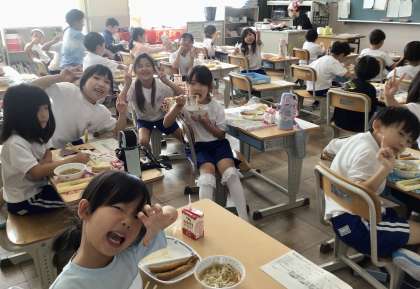 10月15日(火)の梅坪小(9)1年生の給食風景