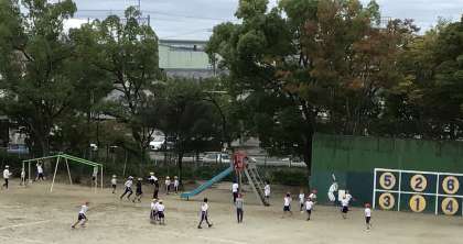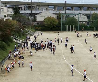 外遊び、5時間目 スポフェス練習の学年とたくさんの子どもたちが運動場に集まっていました。