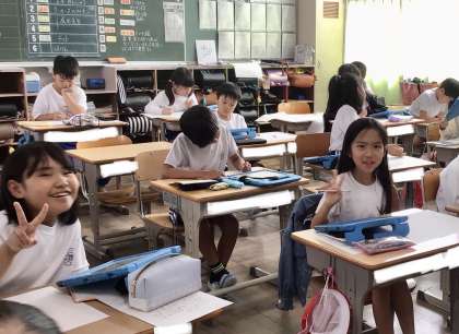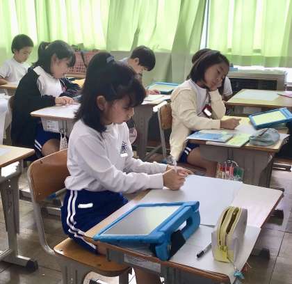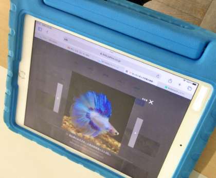 子どもたちは、学習用タブレットで調べたなかからお気に入りの魚を選び、デッサンをしていました。