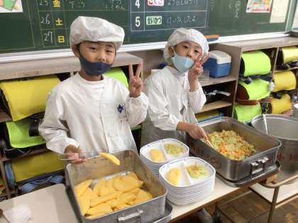 10月24日(木)の梅坪小(7)1年生の給食風景