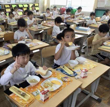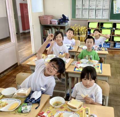 10月24日(木)の梅坪小(9)1年生の給食風景