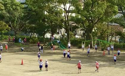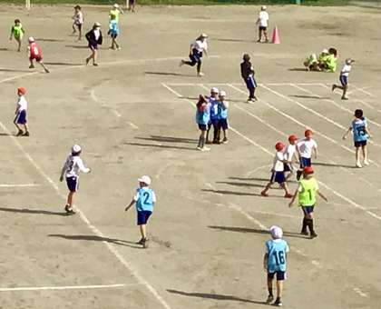 運動場の水たまりをのぞき込み、今後のグランド状態について話しているように見えました!