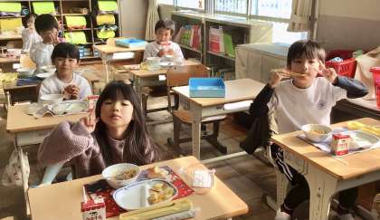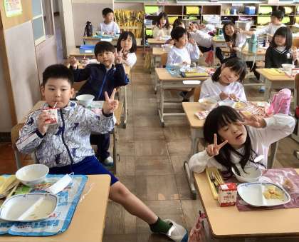 11月21日(木)の梅坪小(8)1年生の給食風景です!