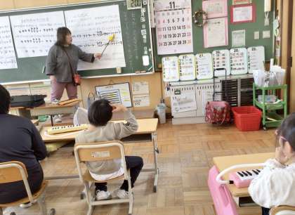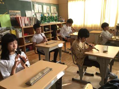 高学年がリコーダー、低学年が鍵盤ハーモニカを担当。