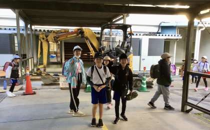 体育館前には、エアコン設置工事のため重機が入っています。