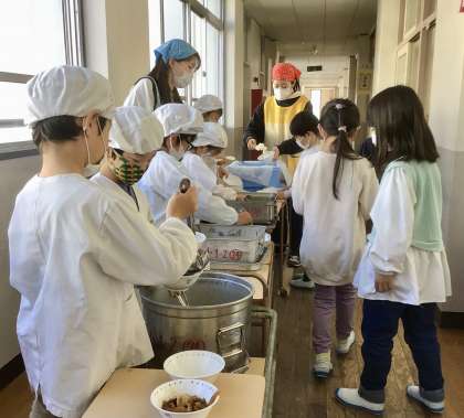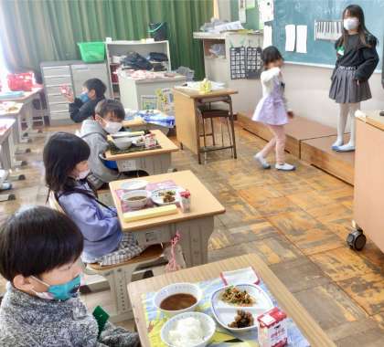 12月2日(月)の梅坪小(5)1年生の給食風景