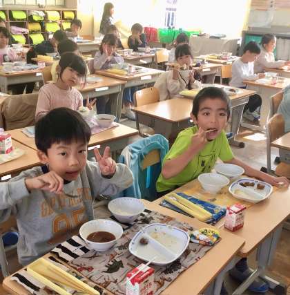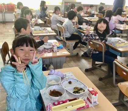12月2日(月)の梅坪小(7)1年生の給食風景