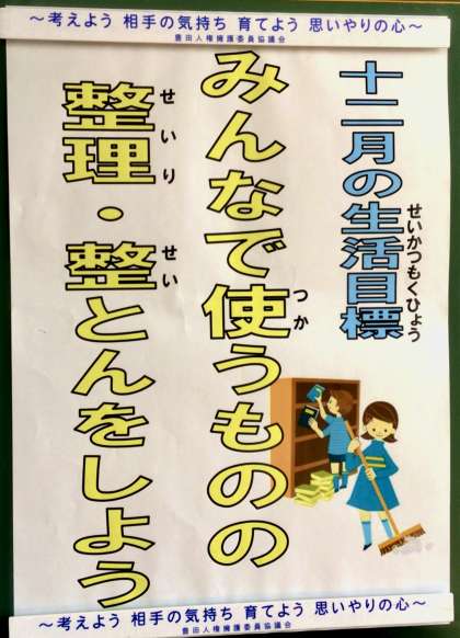 12月の生活目標は「みんなで使うものの整理・整とんをしよう」です。