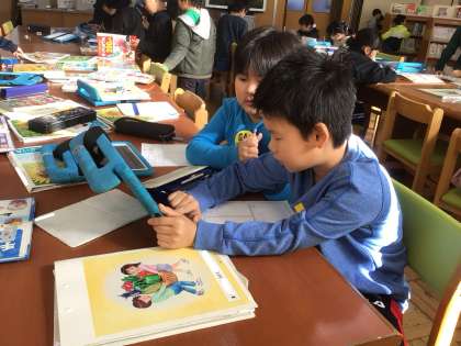 今日は、図書室でおもちゃの本を探して、おめあてのおもちゃの作り方を調べていました。