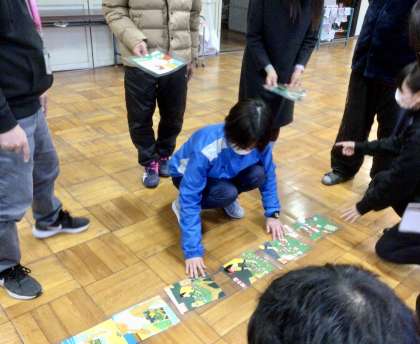 このなぞを発見するのに、あーでもない、こーでもないとお互いに話しながら、気づき始めた教員たちが大きな声で呼びかけ合い、床に並べていきました。