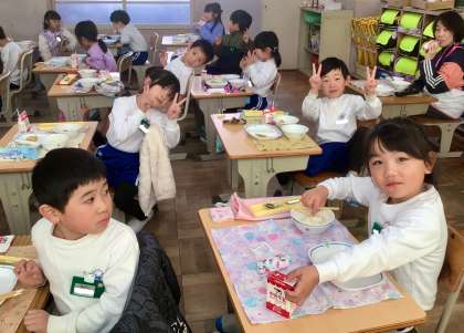 12月11日(水)の梅坪小(9)1年生の給食風景