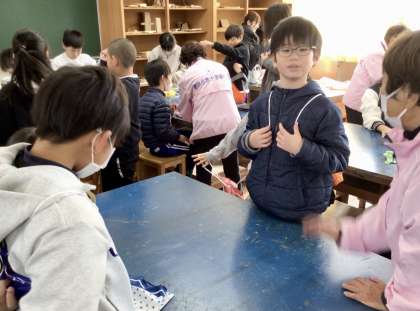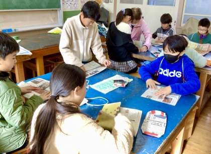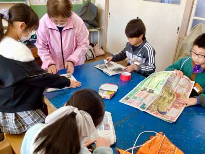 今度は、新聞紙を使って、スリッパの作り方を教わりました。