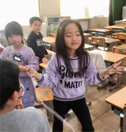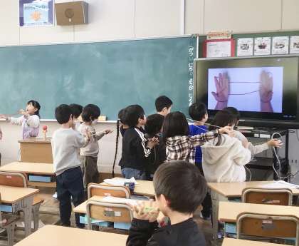 タブレットのあやとり動画を止めながら見せることで、子どもたちの取り組み意欲を高めている様子でした。