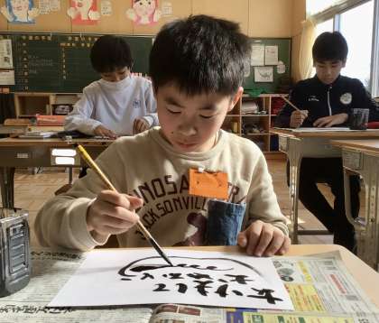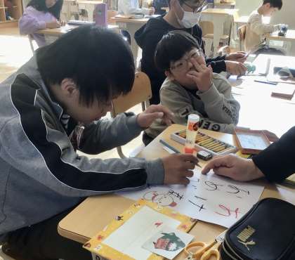 12月17日(火)の梅坪小(17)図工 年賀状づくり 特別支援学級