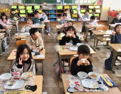 12月19日(木)の梅坪小(8)1年生の給食風景