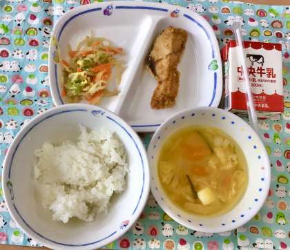 今日は かぼちゃのみそ汁にぶりのからあげ。