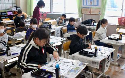 3年生は「山ざくら」。初めての毛筆での書き初めです。
