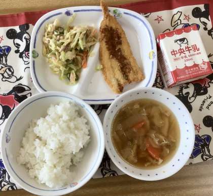 今日のメニューは、かしわ汁に、にぎすフライ。