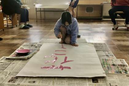 円や三角形の作図が速くできるようになった子、好きな言葉を保護者の皆さんや仲間の前で、筆で書く子もいました。