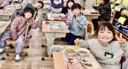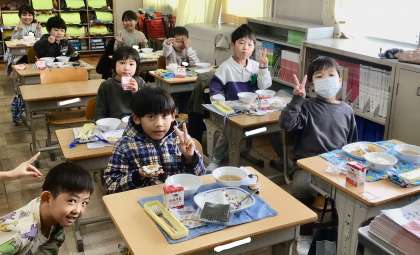 2月10日(月)の梅坪小(9)1年生の給食風景