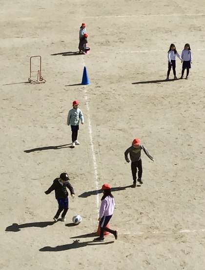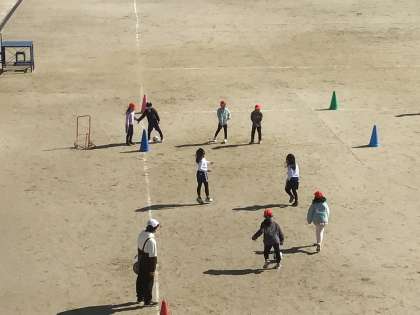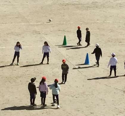 2月13日(木)の梅坪小(6)2年生 体育 ボール蹴り運動