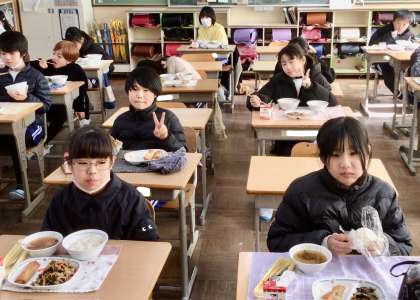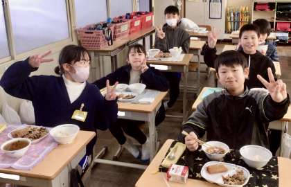 2月13日(木)の梅坪小(12)5年生の給食風景