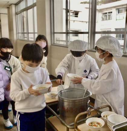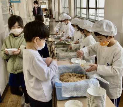 2月17日(月)の梅坪小(7)1年生の給食風景