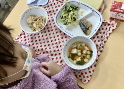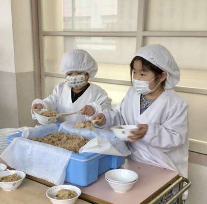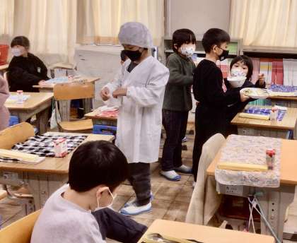 2月17日(月)の梅坪小(8)1年生の給食風景