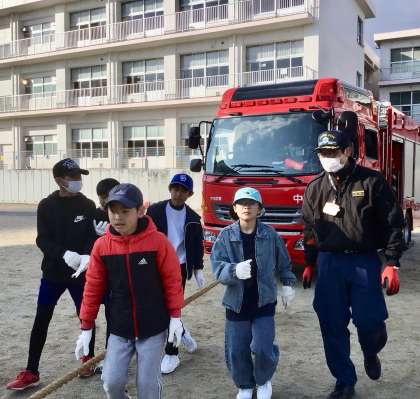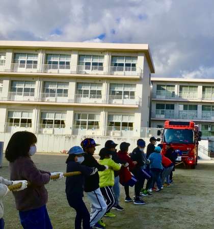 有事を想定して、みんなで消防自動車をロープで引っ張るサプライズがありました!