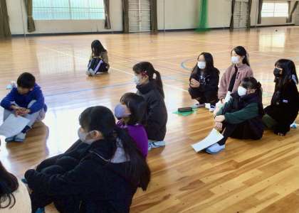 体育館で5年生の「演じるチーム」が、リハのリハを行っていました。