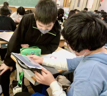 タブレットで、今の世界情勢を調べる子どもたち。