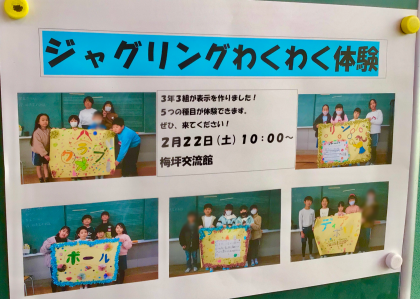 2月21日(金)の梅坪小(6)ジャグリングわくわく体験 表示作成 3年生 公開日 2025/02/21 更新日 2025/02/21 地域学校共働本部(コミュニティ・スクール) ジャグリングわくわく体験が盛り上がるといいですね。 地域の催しをお助けする機会をいただき、感謝申し上げます!