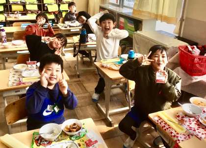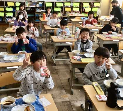 2月26日(水)の梅坪小(10)1年生の給食風景