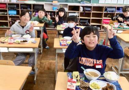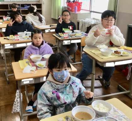 2月28日(金)の梅坪小(7)3年生の給食風景