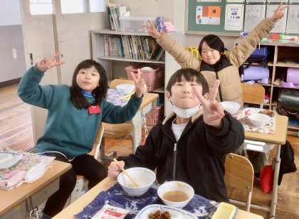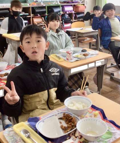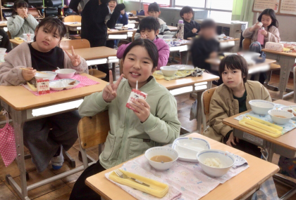 2月28日(金)の梅坪小(8)3年生の給食風景