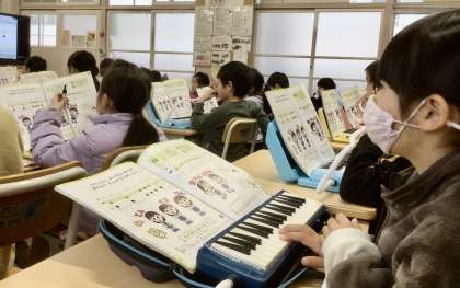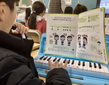 3月5日(水)の梅坪小(15)1年生 音楽 鍵盤ハーモニカ