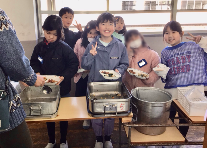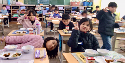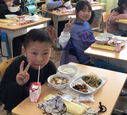 3月7日(金)の梅坪小(8)2年生の給食風景
