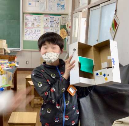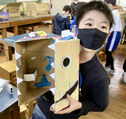 3月14日(金)の梅坪小(14)4年生 図工 おもしろダンボールボックス