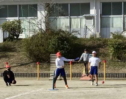 3月14日(金)の梅坪小(20)5年生 体育 Tボール