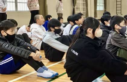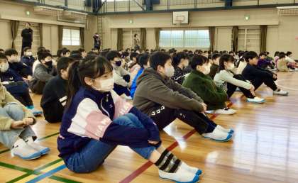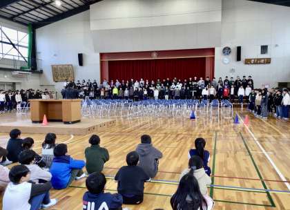 今朝は、5、6年生が3、4年生に歌声を聞いてもらいました。