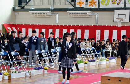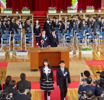 校歌斉唱、卒業生退場です。