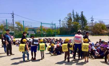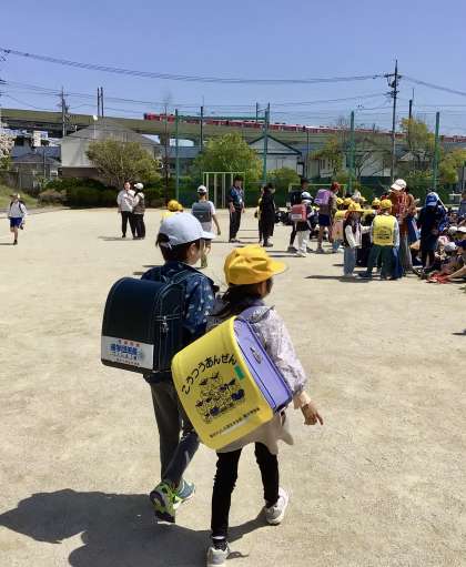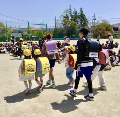 6年生が自分の班の新入生を探し、自分の通学班へ連れて行きました!