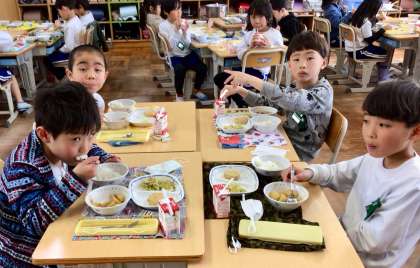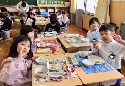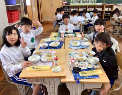 4月10日(木)の梅坪小(6)2年生の給食風景