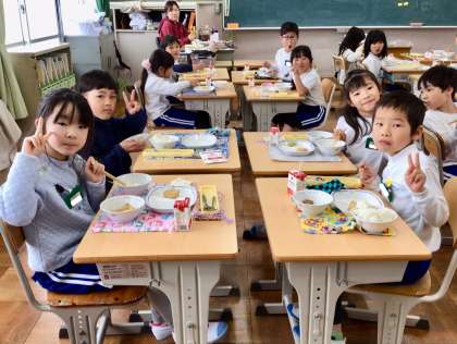 4月10日(木)の梅坪小(9)2年生の給食風景