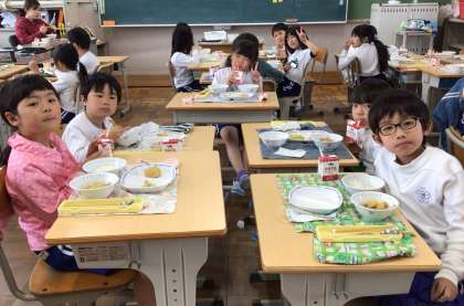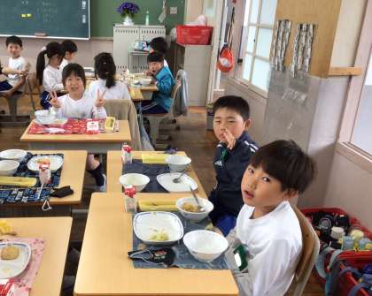 4月10日(木)の梅坪小(10)2年生の給食風景