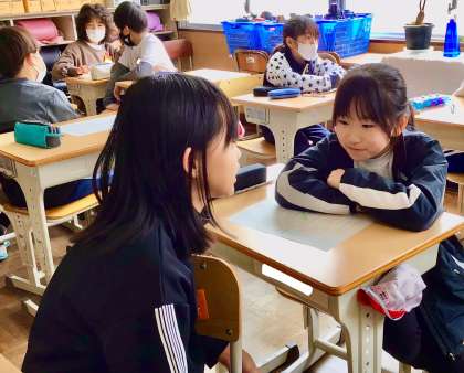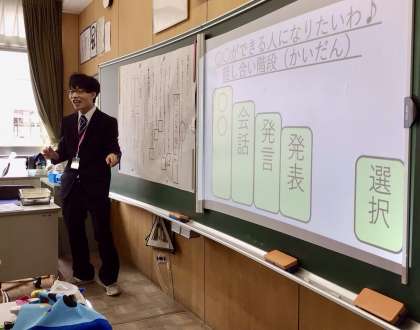 学級開きからわずか4日目にして、発表者の方を向いて目と心で話を聞いたり、ペアやグループでの活発な意見の出し合いなど、模範となる規律ある授業でした。